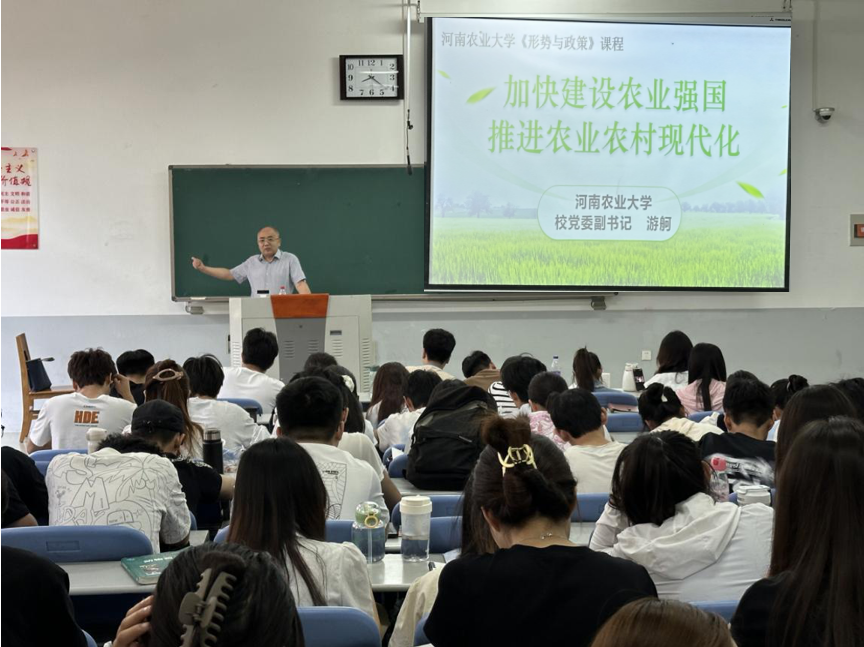校党委副书记游舸围绕“加快建设农业强国 推进农业农村现代化”、校党委副书记何松林围绕“走好新时代科技自立自强之路”、副校长杨喜田围绕“读懂中国式现代化”、副校长郭战伟围绕“读懂中国式现代化”、副校长刘晓永围绕“走好新时代科技自立自强之路”、副校长赵鹏围绕“走好新时代科技自立自强之路”等专题进行讲授,为广大农大学子带来一堂堂精彩纷呈的“形势与政策”课。
