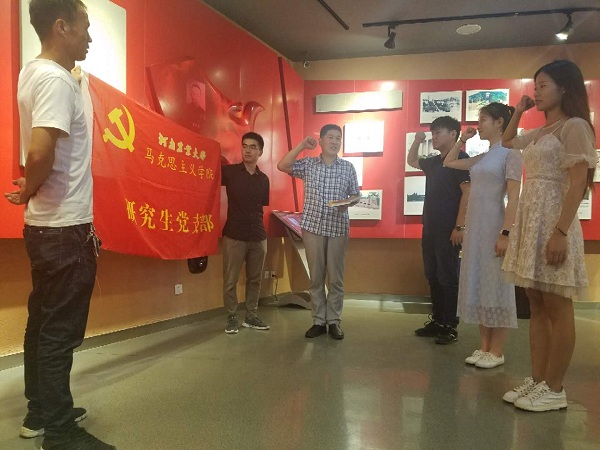 本网讯(通讯员 贾书浩)为了深入学习领会习近平新时代中国特色社会主义思想和党的十九大精神,6月20日下午,做爱自拍 组织研究生党员和入党积极分子赴郑州二七纪念堂开展“不忘初心,牢记使命”主题教育活动暨2019年新党员宣誓仪式。