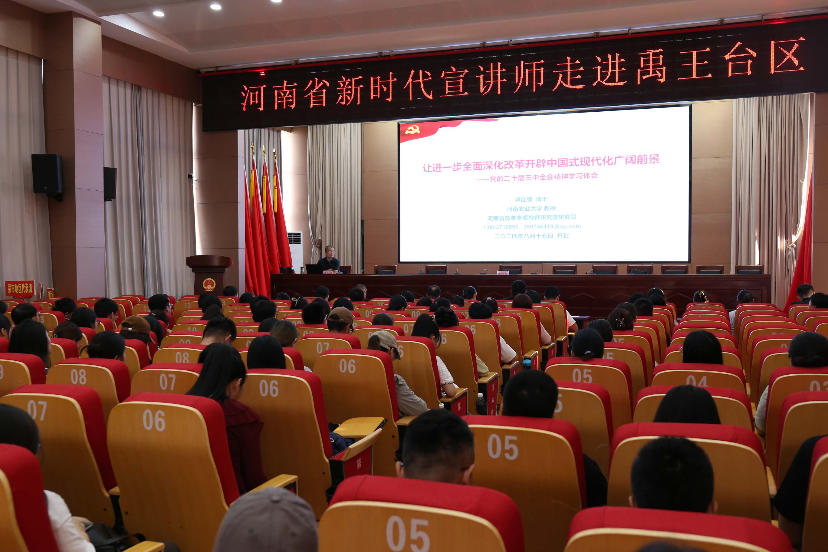 教授尹红领作党的二十届三中全会精神宣讲报告。区直机关全体党务干部、各乡(街道)宣传委员和新入职的公务员、选调生、招才引智青年人才等,约200余人参加。