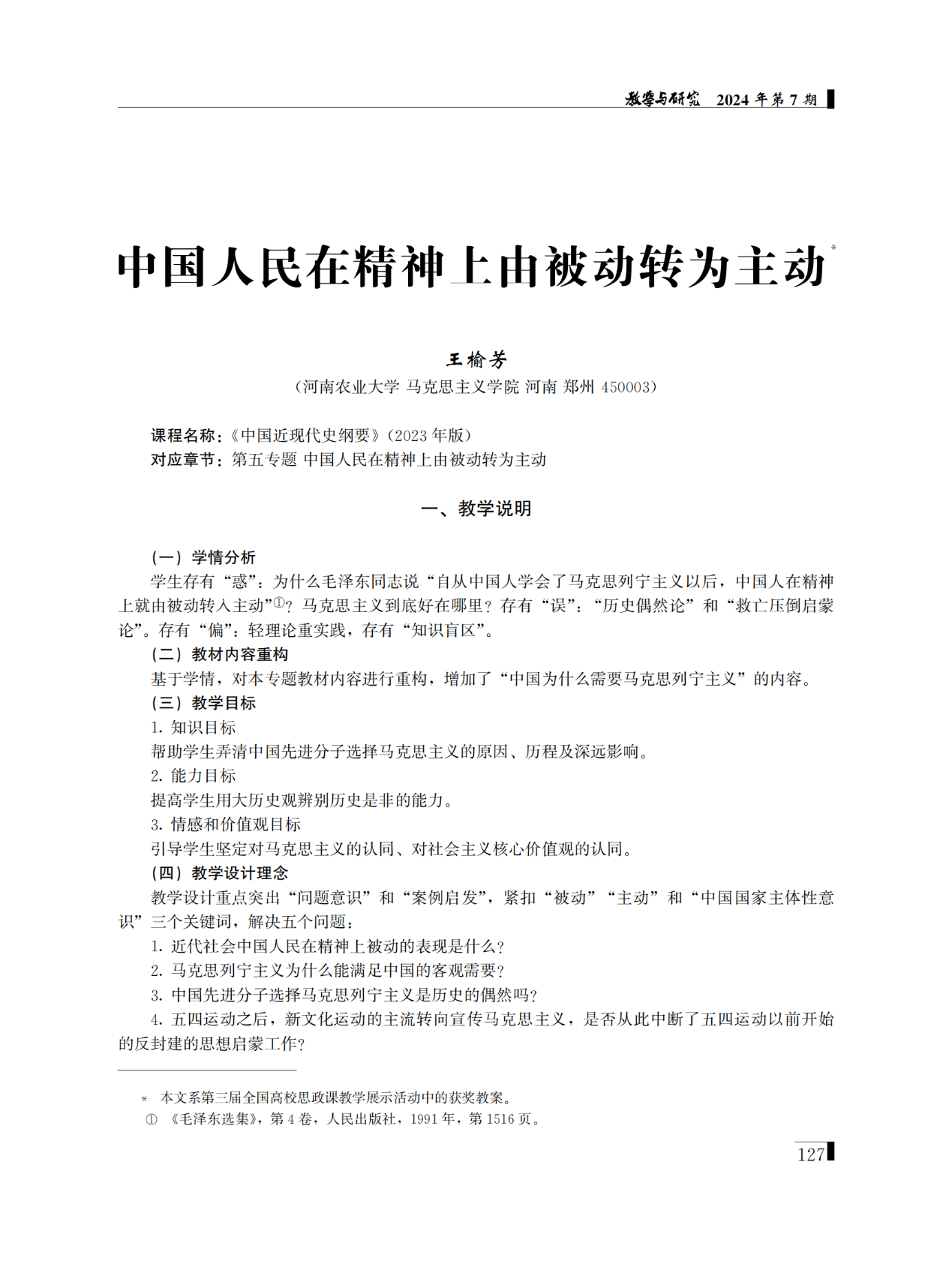 《教学与研究》(CSSCI来源期刊)“第三届全国高校思想政治理论课教学展示”栏目刊发做爱自拍 教师王榆芳获奖教案《中国人民在精神上由被动转为主动》。在第三届全国高校思想政治理论课教学展示活动中王榆芳荣获中国近现代史纲要课程全国二等奖。