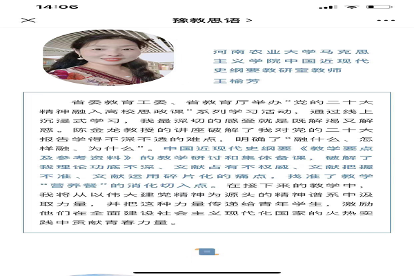 (张璐 刘梦迪 文\图)为深入学习贯彻党的二十大精神,以及习近平总书记视察陕西延安和河南安阳重要讲话精神,推动习近平新时代中国特色社会主义思想进教材、进课堂、进学生头脑,省委教育工委、省教育厅举办“党的二十大精神融入高校思政课”系列学习活动。此次学习研修班活动分专家辅导和分课程研讨两个阶段,分别针对“融什么、如何融”等问题,以及高校思政课《教学要点及参考资料》的综合运用,进行辅导讲学、教学研讨和集体备课。2022年12月16日中心“豫教思语”公众号刊发了研究人员王榆芳博士作为中国近现代史纲要课程教师代表的如下教学感悟: