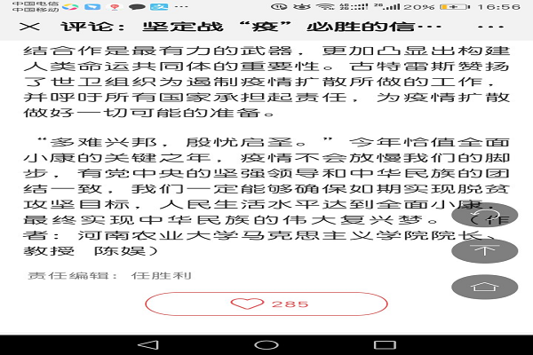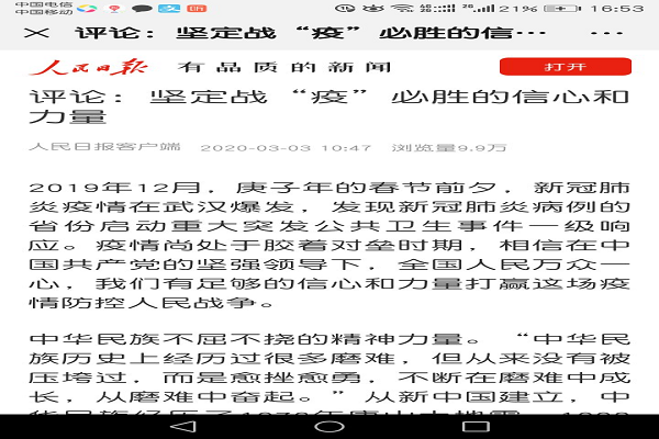 《评论:坚定战“疫”必胜的信心和力量》在人民日报客户端发表
