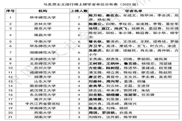 由中国人文社会科学评价研究中心(访问网址://evaluation.chd.edu.cn/)近日通过公众号推送的《中国哲学社会科学最有影响力学者排行榜:基于中文学术成果的评价(2020版)》简版“马克思主义学科”部分显示,我中心研究人员张国富教授(中心原主任)与孙金华教授同时成为最有影响力学者。我省仅有12名本学科专家荣登该排行榜(我省上榜学者数在全国28个排名地区中居第8名)。包括国家“双一流”重点建设大学郑州大学、国家小“211”工程重点建设大学河南大学与河南省社科院、中共河南省委党校等单位在内,全省仅有我校与中共河南省委党校(薛瑞汉、将仁勇)、河南科技大学(苗贵山、张俊国)3家单位有两名入选专家的单位。在全国地方高校、党校与社科院等地方性社会科学研究机构等中有两名以上的单位60家(其中有2名专家入选的单位为25家)。此外,在全国入选167家单位中,中共中央党史研究室、中共中央文献研究室、《求是》杂志社、同济大学、上海大学、山西大学、中国浦东干部管理学院等权威研究机构或知名高校也仅有本学科两名专家入选。其中,孙金华、张国富教授在马克思主义、思想政治理论、中国共产党等3个二级学科中的马克思主义学科中分别排名第57名(总分676.40)、第76名(总分662.36)。