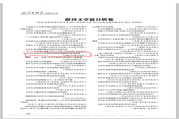 我中心副主任刘歆立副教授发表在CSSCI源刊、全国中文核心期刊《现代哲学》2017年第3期的论文《毛泽东的农民权利思想及其实现道路的革命探索》被中国人民大学书报资料中心编辑出版的“复印报刊资料”《毛泽东思想》2017年第6期全文转载,被中国社科院主办的“中国社科网”2017年12月全文转载。此外,湘潭大学毛泽东研究中心、“毛泽东旗帜网”、“乌有之乡”等网站也同时全文转载。