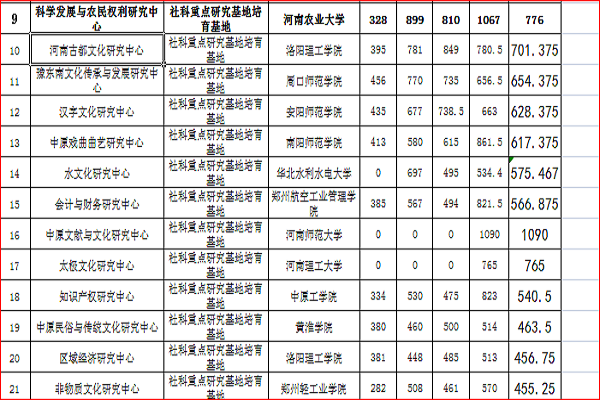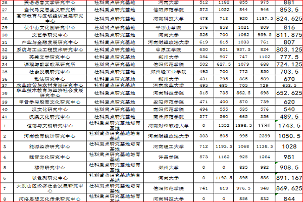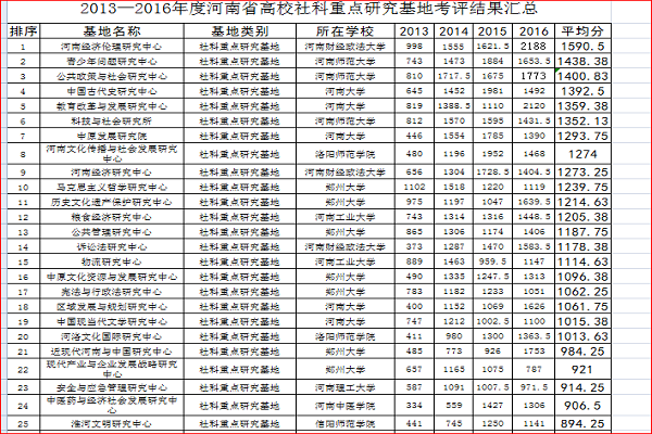 据近日省教育厅有关管理部门对外公示的结果,2012-2016年度我中心四年在全省高校社科重点研究基地(培育基地)年度考核得分依次为328、899、810、1067,四年累计年均得分776,在全省21个培育基地中年均得分排名第9,并超过41个正式基地中的8个基地。对照省教育厅“根据《河南省高等学校人文社会科学重点研究基地建设计划》和《河南省高等学校人文社会科学重点研究基地管理办法》的规定,高校社科重点研究基地实行动态管理,以四年为一个建设周期,建设期满,根据各基地四年来的总体成绩进行排序,四年累计平均成绩排在后10%的,列为培育基地。培育基地中四年累计平均成绩超过重点研究基地后10%的,列为重点研究基地。培育基地中四年累计平均成绩在后20%的取消资格”规定,我中心可以按期转为正式的河南省高等学校人文社会科学重点研究基地。