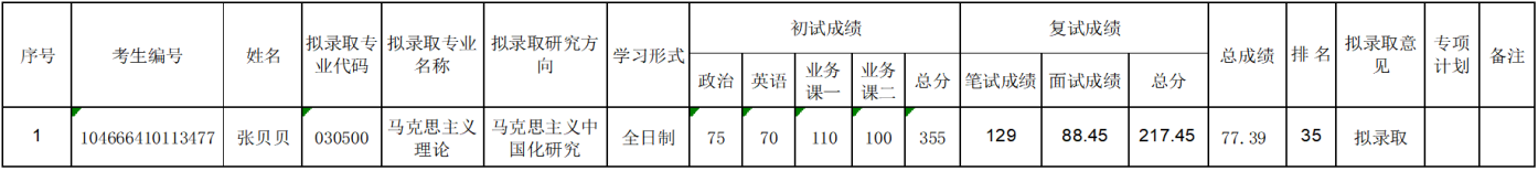 根据我校2026年招生计划的调整,做爱自拍 马克思主义理论专业增加1个招生计划。经学院招生工作委员会研究决定,现对参加一志愿复试未录取的考生,按照总成绩排名,依序进行拟录取,现将拟录取结果予以公示。